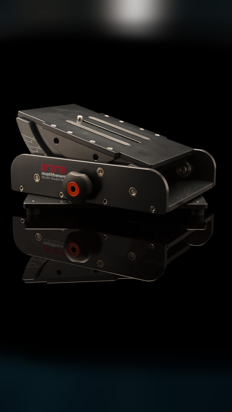 Matthews CAM Tank is designed to accept all large format camera plates or direct mount to any large or medium format camera equipped with 3/8″-16 mounting holes. The CAM Tank was designed for extremely low shots, without taking away your ability to pan and tilt the camera. It is also used to achieve dutch angles when mounted to a fluid head, or shots designed to be pointed straight down off of a fluid head on a tripod or jib. The bottom of the plate has 17 strategically placed 3/8″-16 tapped holes spaced 1″ apart, complying with Motion Picture Industry Standards. The system is CNC machined out of 6061 T6 aluminum, stainless steel hardware. The pan bearing uses a machined polyoqymethyline, delrin disk, which self-lubricates and has an endurance rating 100x more than any plastic. The tilt system uses 4 premium NSK deep grooved ball bearings, made in Japan. Both pan and tilt functions come with brakes for lock off shots and camera safety.